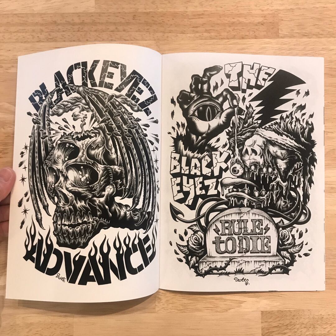 UCAN started what would form the core of his current style in 1997, in his hometown of Aizu in Fukushima. He built up experience working on flyers for local live shows before moving to Sendai. Influenced by punk and hardcore, he has been playing in bands from that time until now. He currently plays guitar in a band called Essence. With the launch of his brand “BLACKEYEZ” in 2009, he has produced solo exhibitions, events, and a clothing line, evolving his style day by day while creating new artwork that surpasses modern genres.
