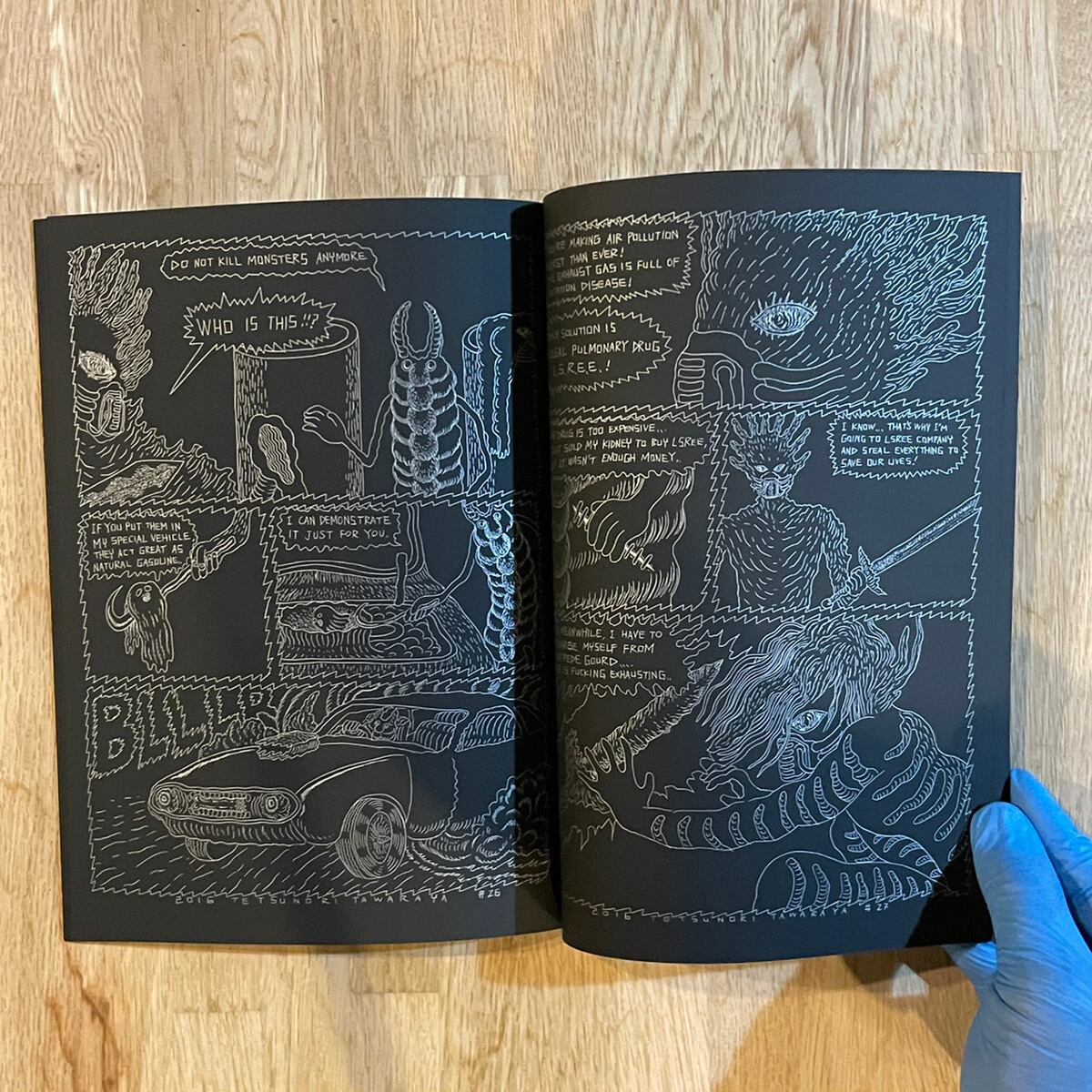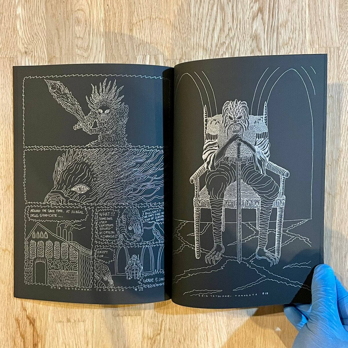 厚手の黒い紙にシルバーインクでプリントされたコミックブック。